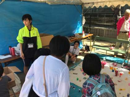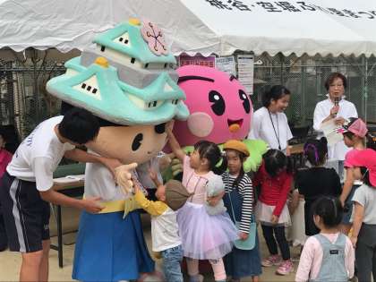 中央区のマスコット、ももっぴーや夢丸くんの着ぐるみに入り、暑さにも負けず、子どもたちを喜ばせてくれていました。また、遊びコーナー担当も一生懸命小さい子の相手をしてくれていました。桃谷地域の方々からの「上中生が毎年応援に来てくれて本当に助かります。」という声をたくさん聞きました。参加してくれた皆さん、ありがとうございました!