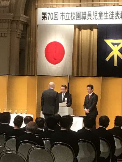 11月3日、大阪市中央公会堂において、 第70回市立校園職員児童生徒表彰式が行われ、笹田校長先生が「職務精励」により表彰を受け、教育長から表彰状を受け取りました。