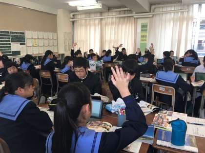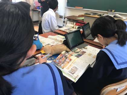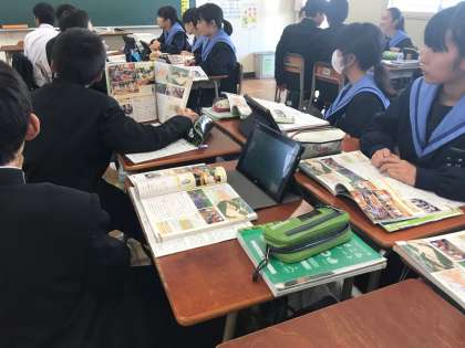 1年の社会でタブレットを使った授業をしていました。EUに加盟することでどんな良い点、課題があるかをみんなで考えていました。その考える手助けとしてのタブレットです。班で話し、全体で発表する感じでした。タブレットを通して、世界を広げていってほしいですね。