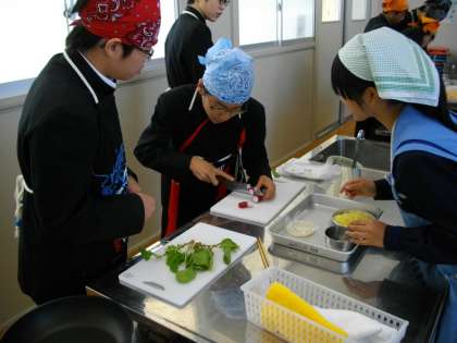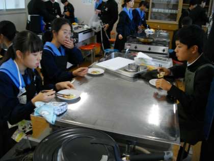 今日は2組が調理実習です。どの班も手際よく調理実習を進めていました。盛り付けるときにピザがひっくり返るというハプニングもありましたが、それもおいしく食べていました。