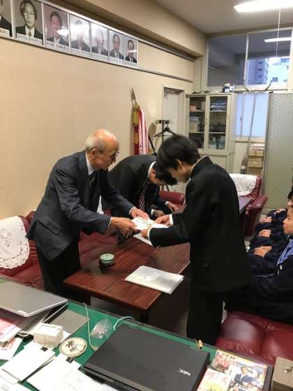 設置と前後しましたが、寄贈式を行い目録の贈呈につづき、生徒会代表よりお礼のあいさつをしました。