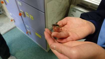 別の生徒が、初めてコオロギに触れました。(写真)