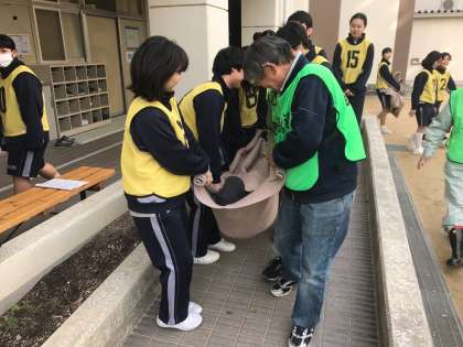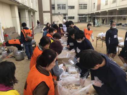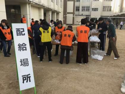 けが人を運んだり、非常食を作り、配付するなど、様々な仕事があります。