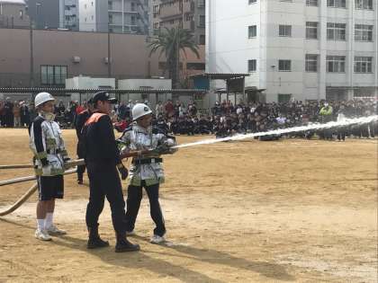 最後に生徒、地域の方々全員が運動場に集まり、地域及び生徒代表による可搬式ポンプによる放水訓練を見て、その後、消防署の方、中央区長、原田会長から講評をいただき、訓練を終えていきました。皆さんがおっしゃっていたように、被災した時に中学生は大きな戦力になります。万が一の時には、今日の経験を絶対に活かしていこう!