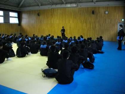 上町中学校周辺は、津波被害の確率は低いと言われています。しかし、地震が発生したらどうなるのか?なぜ危険と言われているのかを詳しくお話いただきました。学校周辺だけでなく、大阪の街の特徴・予想被害状況も映像などで説明いただきました。