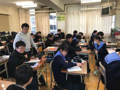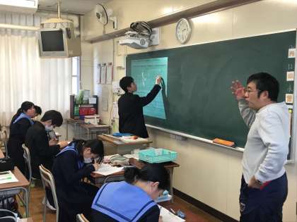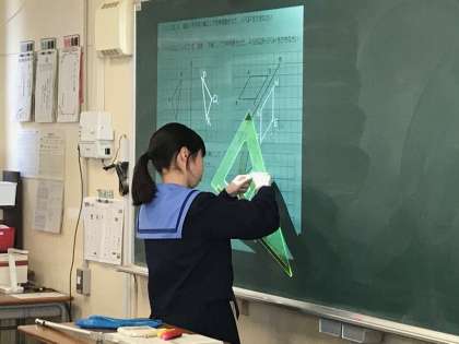 1年の今日の数学は、図形の線対称についての作図の学習をしていました。二塚先生の「対称の軸で折りたたんだら、ぴったり重なるように描くねんで。」という説明で、実際にプリントを折りたたんでいる人もいました。ただ、対称の軸が斜めに描かれていると、多くの子が最初は戸惑いを見せていました。対称の軸が真っ直ぐになるようにプリントを動かして考えたり、移動する点から定規を対称軸に垂直にあてるなどして、工夫をして理解する人など、みんな頑張っていました!