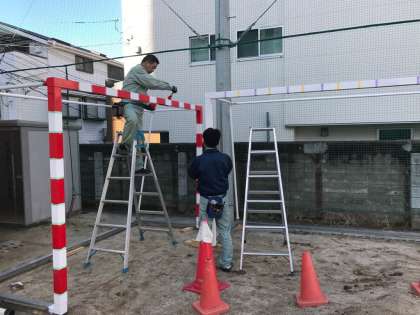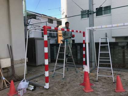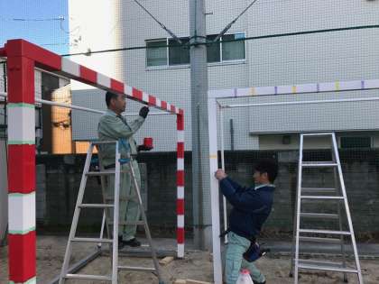 管理作業員さんたちは今、運動場の古くなったハンドボールゴールの修理と塗装をしてくれています。赤と白の幅を同じにするために、正確に測ってマスキングテープを活用し、きれいな仕上がりになるように丁寧に作業してくれています。赤色が鮮やかで、新品を買ったような仕上がりになると思います。みなさん、特にハンドボール部のメンバーは楽しみに待っていてくださいね。管理作業員さん、いつもありがとうございます!