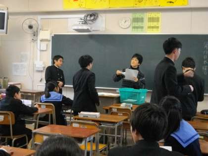 総合の時間に3学期に行われる職場体験の担当事業所発表とカルタ大会のメンバー決めをしました。また事業所に渡す自己紹介カードも記入しました。職場体験に向けて気持ちを引き締めていきたいですね。