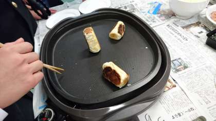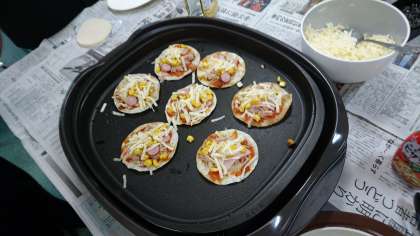 「ぎょうざピザ」は、生徒の好みで色々なトッピング(ウインナー・ハム・玉ねぎ・ツナ・コーン・お餅・味付け海苔)を選んで、ぎょうざの皮の上にミックスチーズ・ピザソースと一緒にのせました。(写真下)
