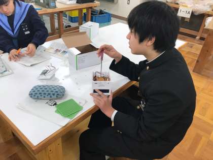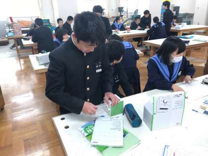 2学期もいよいよ終わろうとしていますが、2年の技術ではキュービックラジオの製作の最後の点検を行っていました。あと数名の人が点検を終了すれば全員完成です。はんだごてを使っての接着や細かい配線など、難しい部分もあったと思いますが、完成し、ラジオ放送が聞けたときの喜びは格別です。お家でも活用してくださいね!