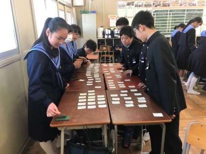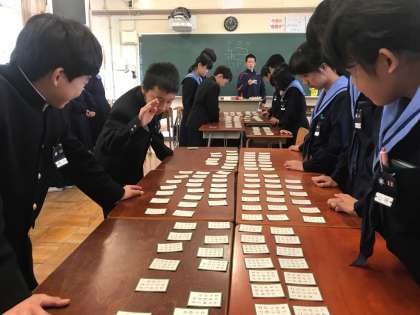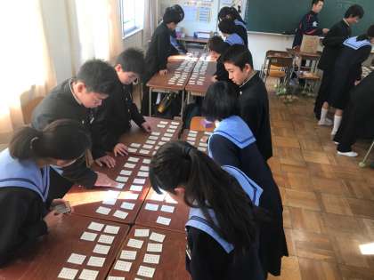 1年の国語では今、百人一首の学習をしています。今日は、各班の中でそれぞれ2組に分かれてチーム対抗、併せて個人戦も行っていました。1年生でも上の句を聴いただけで札を取る人もいて、なかなかレベルが高い人もいるなぁと感じました。学年で百人一首大会が行われる時には活躍できるように、一つでもたくさん覚えよう!