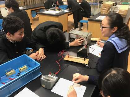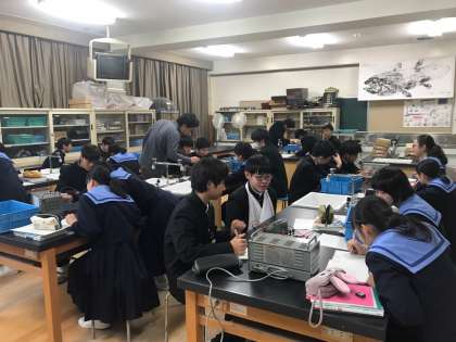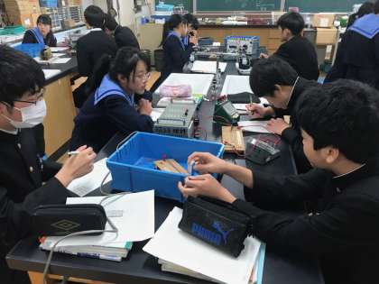 今日の2年生の理科は、理科室で電気に関する実験を行っていました。電流計・電圧計、電熱線を使って様々な場合のデータを測定して、電圧と電流の関係に規則性を見出そうとするものです。装置は単純なのですが、計器の見方が分からなかったり、うまく電流が流れなかったりして、最初はいくつかの班で苦戦をしている様子もうかがえました。得たデータからしっかり規則性を見つけてくださいね!