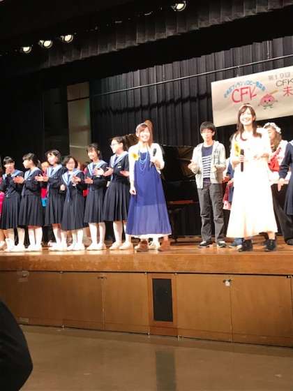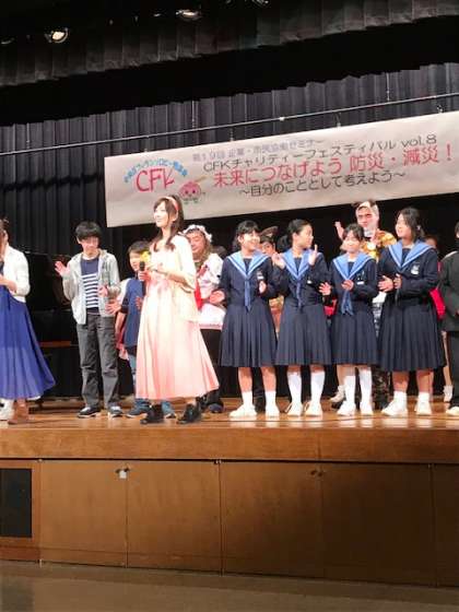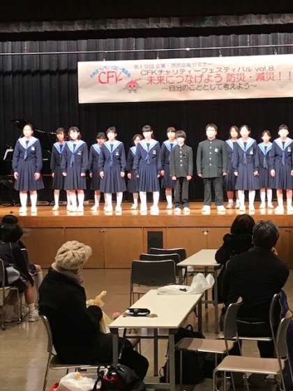 合唱部は、単独で歌う時間をもらった後、恒例のフィナーレの全員合唱の時も舞台の中央で、プロのデュオ「あまゆーず」と一緒に歌わせていただきました。防災・減災に少しでも意識のある人々が、こんな機会に集って、今回のテーマのように「自分のこととして考える」ことは、とても大切だと思います。学校でも防災について学んでいる上中生が率先して、震災のことを風化させないように行動してほしいと思います。参加して盛り上げてくれた上中の皆さん、お疲れ様でした!