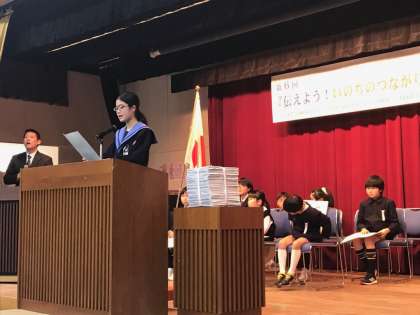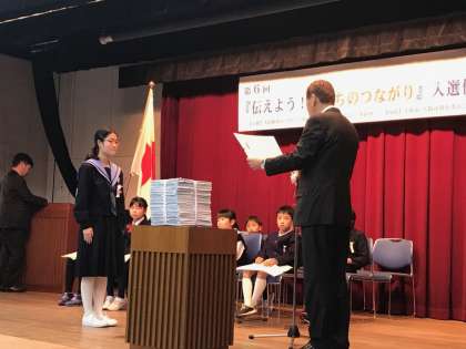 当日は木戸脇さんしか参加できませんでしたが、緊張しながらも堂々と自分の作文を朗読してくれました。お疲れ様でした。また、生徒集会の時に全校の前で表彰状の伝達をします。