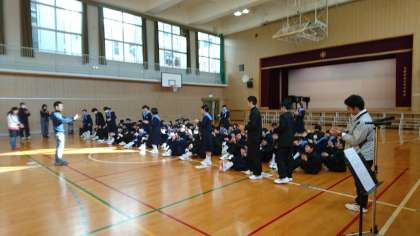 ・中央聴覚支援学校の生徒さん達が帰った後、この約半年間、中央聴覚支援学校の生徒実行委員さん達と一緒に、第1回中央聴覚支援学校交流会のアイスブレーキング・レクリエーションを考えたり、当日の司会進行をしたり、今日のために率先して手話歌の練習をしたりした生徒実行委員達の労と、他の生徒達みんなの協力(いつも、ひな壇の後片付けを手伝ってくれた1年ハンドボール部員を含む)に感謝して、拍手しました。(写真下)