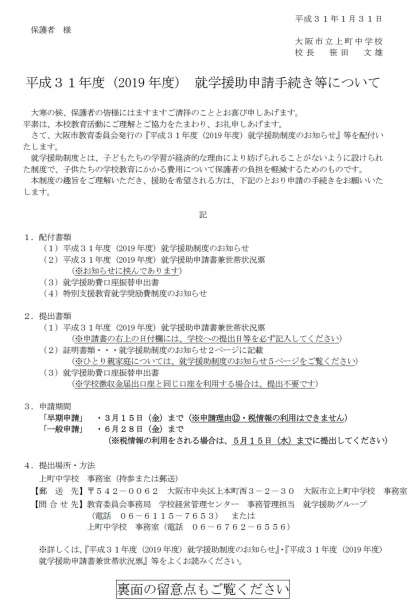 ホームページ右下の配布文書の「事務室」の所に、本日、お子さまを通じて、保護者の皆様へ配付しております、「平成31年度 (2019年度) 就学援助申請手続き等について」の文書を掲載しておりますので、ご覧おきください。