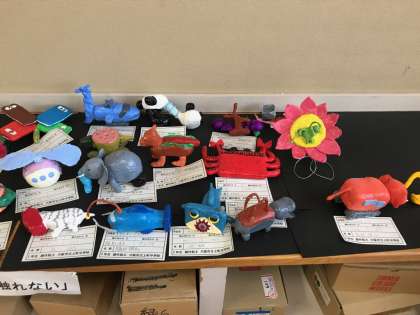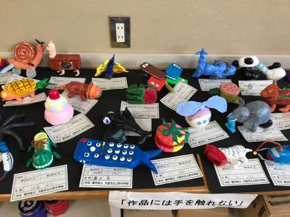 単に2つの物を引っ付けただけでなく、それぞれの特徴をうまく組み合わせて、「こんなん実際に存在しそうやな。」と思わせてくれるぐらいに精巧にできている作品もあります。展示が終わり、家に持って帰ったらお子様の作品をじっくり見てあげてくださいね。