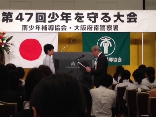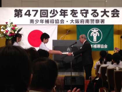 7月30日(水)ホテル日航大阪で「第47回 少年を守る大会」が開催されました。この大会は大阪府南警察署と南少年補導協会が主催するもので、青少年の健全育成のために非行防止や有害環境の排除を目的にしています。毎年、各小中学校から「標語」「意見発表」「絵画」「書道」などの作品を募集し、その優秀作品の表彰も行われました。本校からは標語の部で1年生の中岡駿佑くんが、絵画の部で3年生の小林龍之介くんが金賞を受賞しました。また、本校の多くの作品が銀賞、銅賞に輝きました。