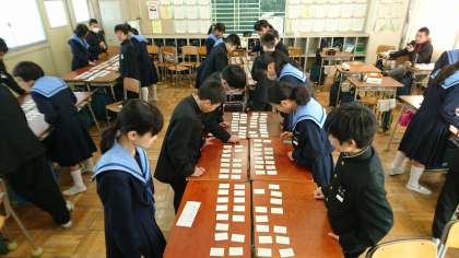 2/4(月)1限目学活の時間、1年生は今週木曜日に迫った「かるた大会」に向けて、百人一首の練習をしました。