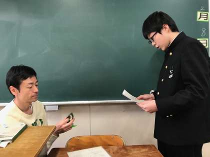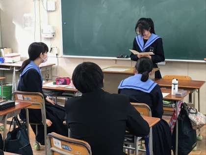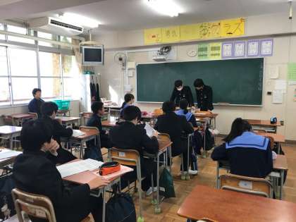 今日は、2年生が職場体験の事後の取組として、事業所ごとに自分たちの体験を文章にまとめて、発表する練習をしていました。各グループの中で優秀なものを学年全体の中で発表するという取り組みだそうです。みんな当時のことを思い出して、一生懸命書いていました。グループ代表に選ばれるように頑張ってくださいね!