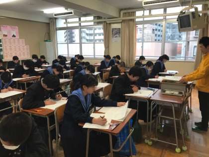 今日から3日間、1・2年生は学年末テストに取り組みます。今の学年では最後の定期テストになります。開始の合図とともに、みんな一斉に問題に取り組み始めました。(下の写真は、1年生です。)