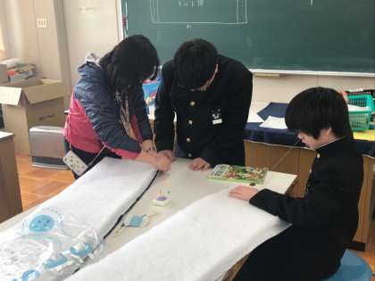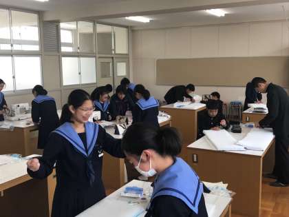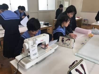 1年の家庭科では、防災ずきんを作っています。今日は、中に入れる綿がずれないように布と縫い合わせる作業をしていました。仲西先生の指示通りに作ろうと、定規で丁寧に長さを測って作業する人も多く、みんなの生真面目さを感じました。実際に役に立つものなので、しっかり作ってくださいね!
