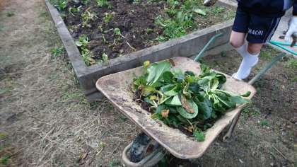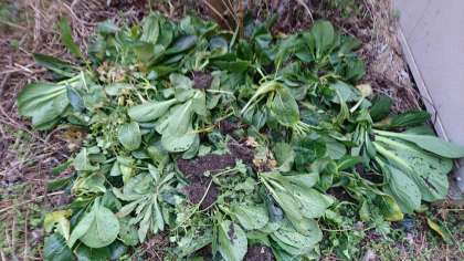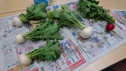 年末に一度収穫した後、冬の間放ったらかしにしていた畑を見に行くと、収穫しなかった小松菜や赤カブ・白カブが巨大化していたので、収穫しました。