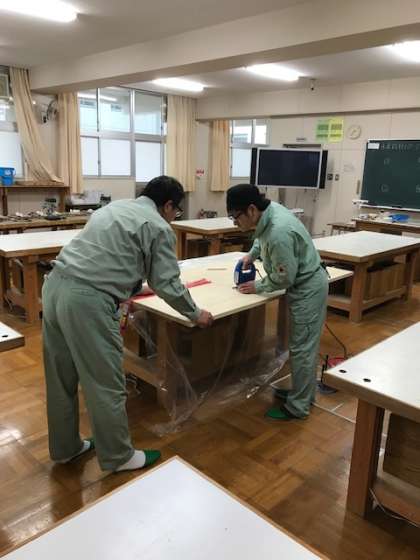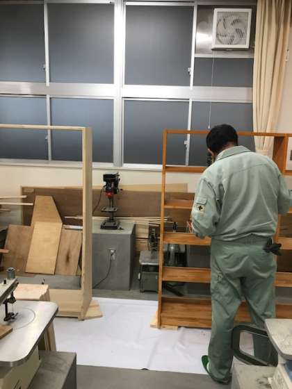 この間、日常の仕事の合間を使って、管理作業員さんが図書館の書架を一から手づくりで作ってくれていました。材料である材木を買ってきて、寸法を測り、正確に切り、面取りをしたり、模様を入れたりして、すごく細かい作業を行っていました。また、管理作業員さんは、常に生徒の安全を考えて作ってくれています。随所にその心遣いが表れています。