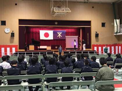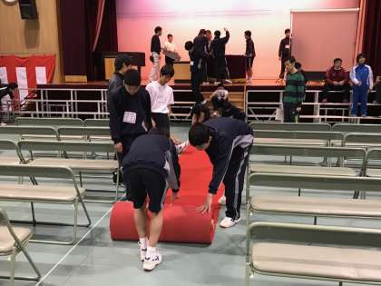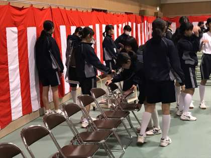 最後にレッドカーペットを敷き、会場設営が完成しました。明日は、2年生も在校生を代表して参加させてもらいますが、最後に「送別の歌」を練習して、準備を終えていきました。明日の3年生の凛々しい姿をしっかり目に焼き付けて、上中の良き伝統を引き継いでいってほしいと思います。3年生の保護者の皆様、是非ご参加いただきますよう、よろしくお願いいたします。