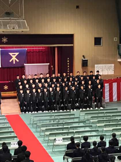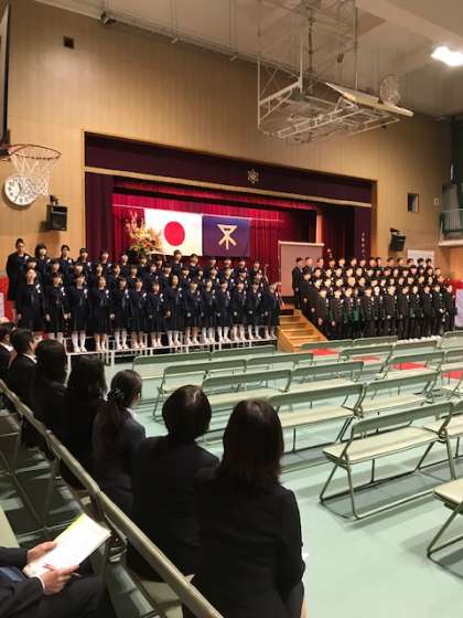 式後に旅立ちの歌として卒業生による「虹」が披露されました。男女ともによく声が出ていて、歌声も美しく、素晴らしいものでした。感極まって歌えなくなるほど号泣する生徒もいましたが、最後まで立派に歌い切りました。この学年らしい色が出た、とても素敵な卒業式となりました。