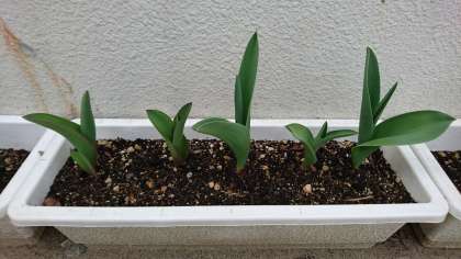 昨年11月の小学生部活動体験で、プランターに植えたチューリップは、順調に育っています。(写真上・中)