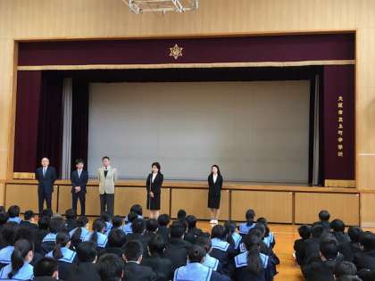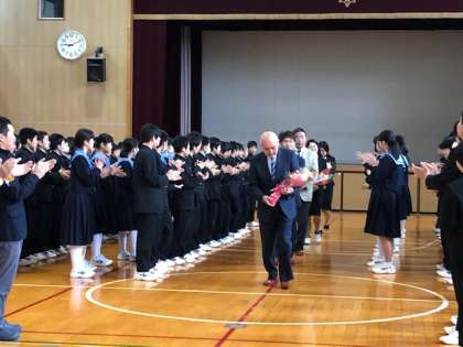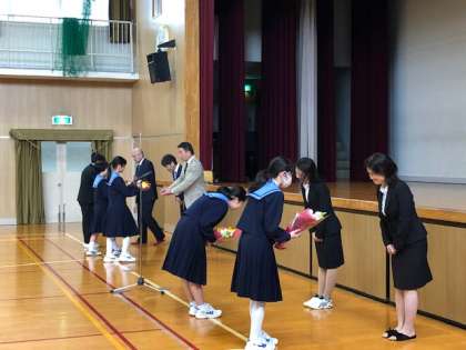 お一方ずつお別れの言葉をいただき、生徒会メンバーから花束贈呈が行われました。最後に生徒・教職員で花道をつくり、拍手で皆さんを送り出しました。上中生のために本当にありがとうございました。