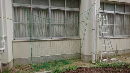 園芸部では、1年ぶりに「緑のカーテン」を復活させるため、校舎の2Fから青空教室裏の畑にネットを下ろしました。