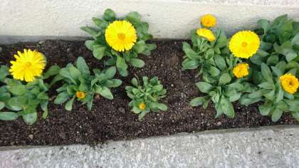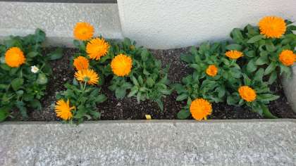 昨年12月初旬に、中庭の花壇へ移植したキンセンカ(マリーゴールド)が満開です。(写真上)