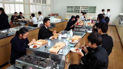 ○調理室・・・家庭科の調理実習が行われます。行事の時の控室や家庭科部などの活動にも使われます。土足禁止です。