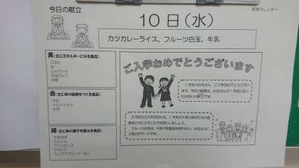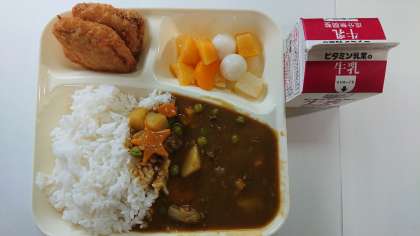 本日の献立は、カツカレーライス、フルーツ白玉、牛乳です。
