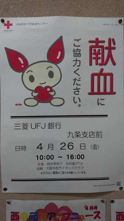 4月26日(金)に、五校園PTA主催の「献血」が行われます。