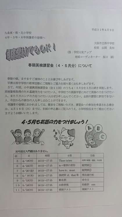 3月に実施した第1〜4回につづいて、第5〜11回の「春期英検講習会」の案内を、校区小学校より配付していただいています。