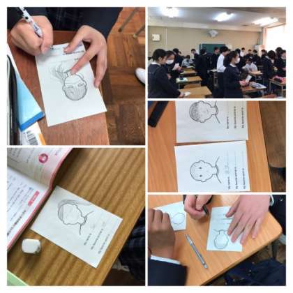 自己紹介の後は、みんなで自分の似顔絵を描いて、クラスメイトにインタビューゲームをしました。みんな自分の顔の特徴をよくつかんでいて上手に描けました。