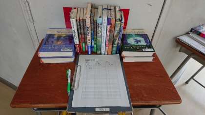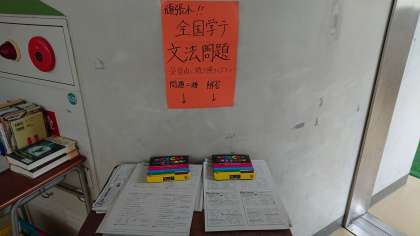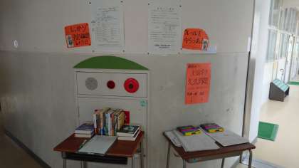 3年生の廊下には、「全国学テ」の演習問題と、「朝読書」用の貸し出し図書が置かれています。