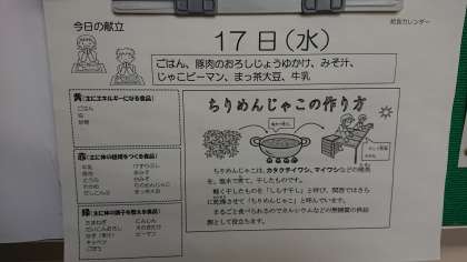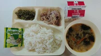 本日の献立は、豚肉のおろし醤油かけ、じゃこピーマン、味噌汁、ごはん、牛乳、抹茶大豆です。