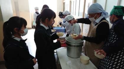 1年1組では、担任の先生が配膳を手伝ってくださっていました。