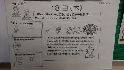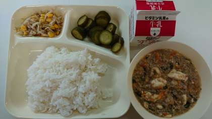 本日の献立は、マーボー豆腐、きゅうりの甘酢漬け、もやしとコーンの胡麻炒め、ごはん、牛乳です。