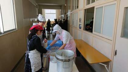今日も、配膳員さんが1年生の配膳を手伝ってくださっています。