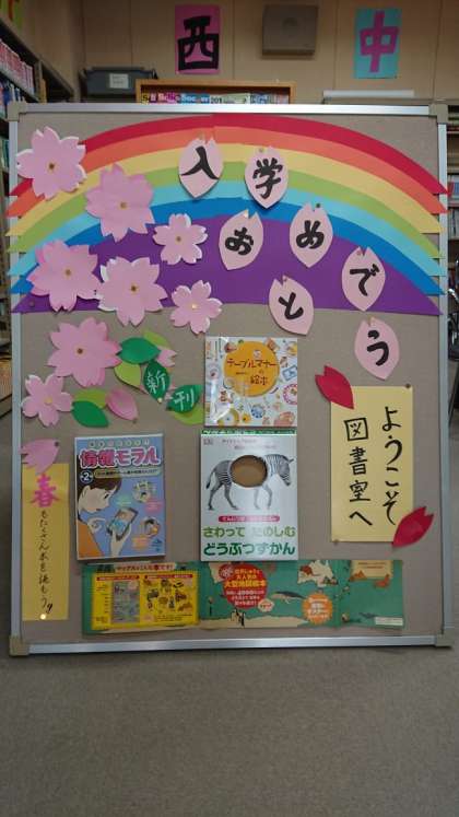 図書館の入り口の飾りつけも、図書館補助員さんが「入学おめでとう」バージョンにかえてくださいました。