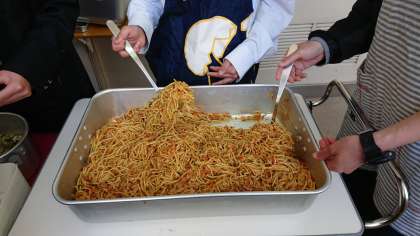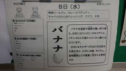 子どもたちお待ちかねのカレースパゲッティに、人気の黒糖ロールパン、そのうえバナナが付いてお腹いっぱいです。