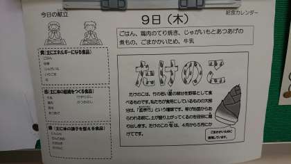 本日の献立は、鶏肉の照り焼き、じゃがいもと厚揚げの煮物、ごまかか炒め、ごはん、牛乳です。