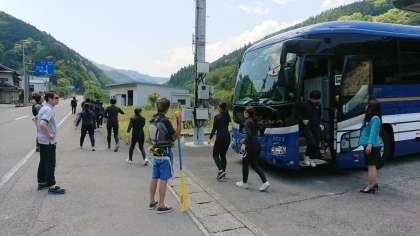 ウェットスーツに着替え、再びバスで移動して、ラフティングスタート地点に到着しました。