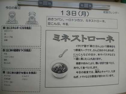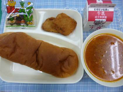 本日の献立は、おさつパン、一口トンカツ、ミネストローネ、豆こんぶ、牛乳です。