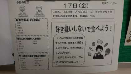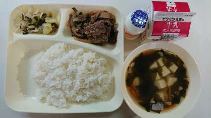 本日の献立は、プルコギ、チンゲン菜ともやしのゆずの香あえ、豆腐のスープ、ごはん、牛乳、発酵乳です。